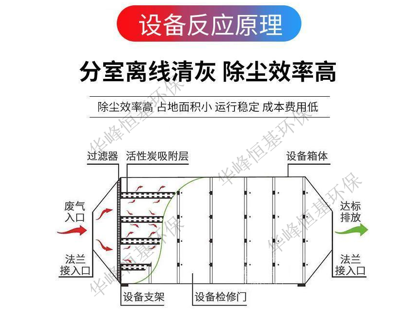 該裝置的處理流程包括三部分:干式除塵、吸附氣體流程、脫附氣體流程;